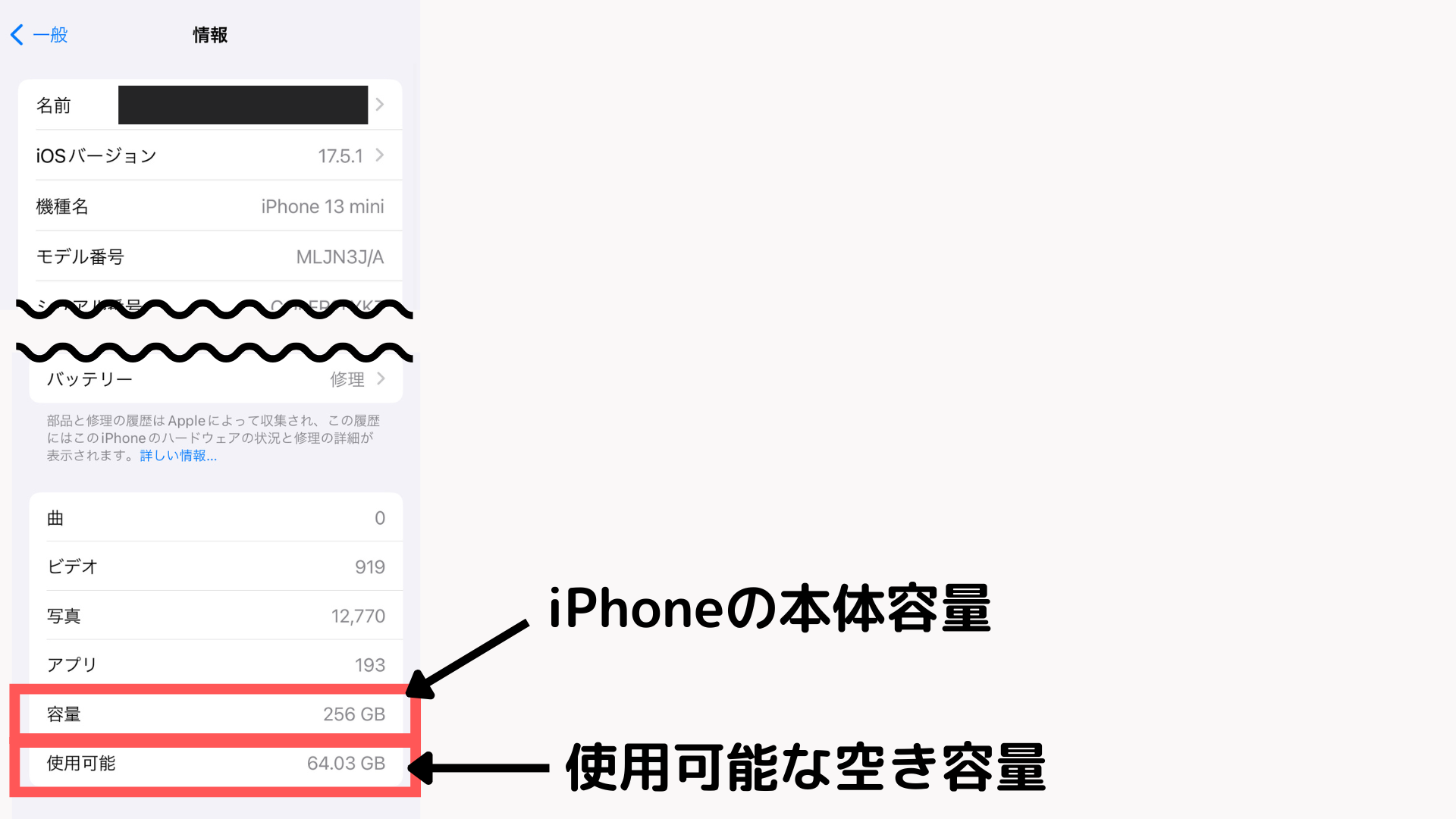 そもそもiPhoneは64GB・128GB・256GBなど容量が決まっており、容量の大きさはiPhoneの設定アプリから「 一般 → 情報」の「容量」の欄から確認ができます。